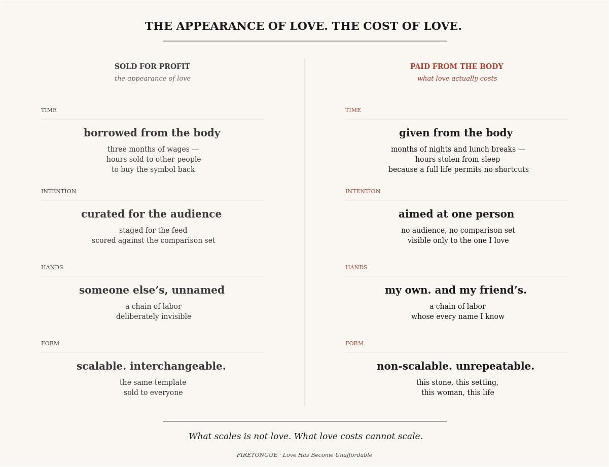 The version that costs you something cannot scale. Time given from the body. Months of nights and lunch breaks. Hours stolen from sleep because a full life permits no shortcuts. Intention aimed at one person, no audience, no comparison set, visible only to the one I love. Hands that are my own, and my friend’s, a chain of labor whose every name I know. A form that is non-scalable, unrepeatable. This stone, this setting, this woman, this life.