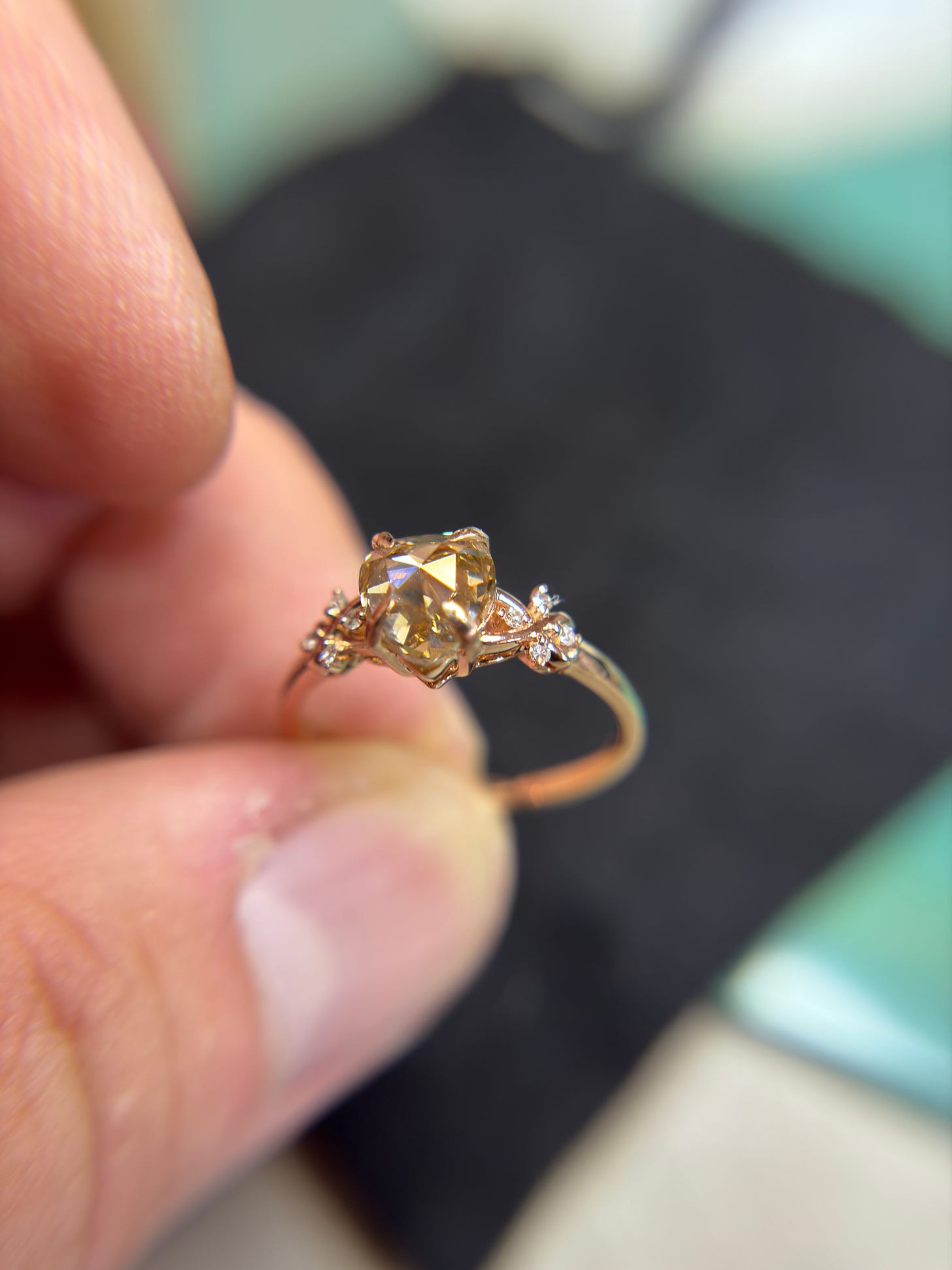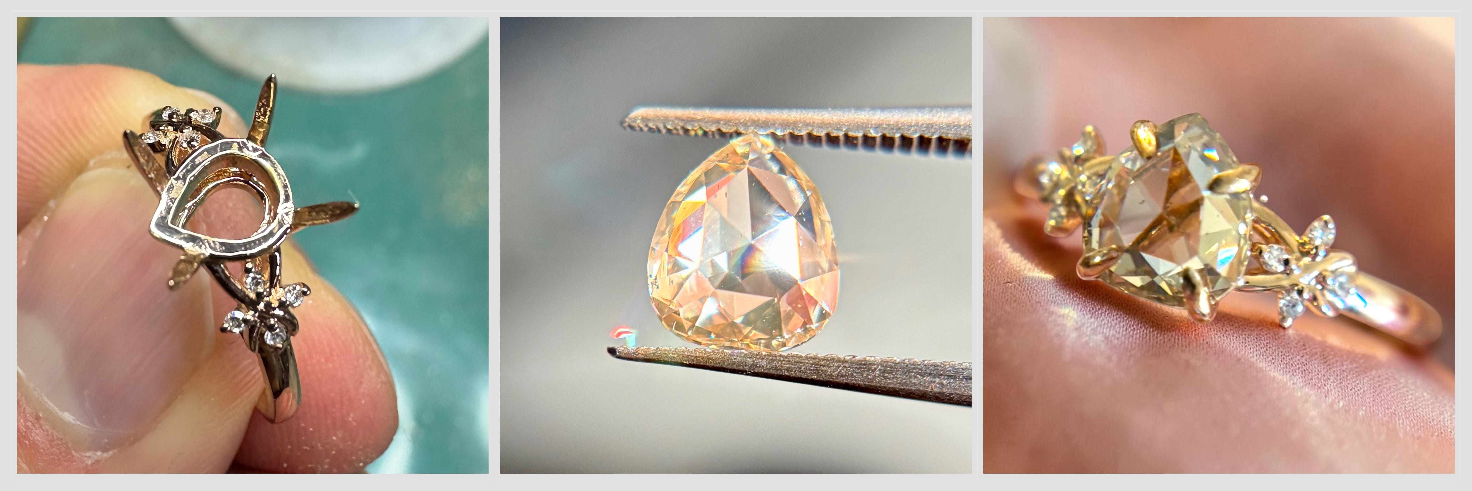 Then I needed the setting. The mass-market houses build for the round brilliant. They do not understand a pear rose cut from the 1800s. I searched for weeks. I found an independent jeweler in Australia who did. I ordered it in 14karat rose gold with accent diamonds. More weeks for it to arrive.
