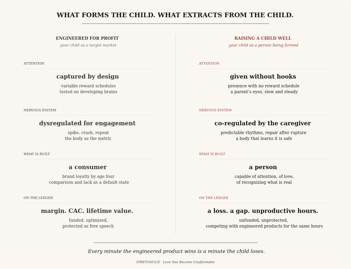 The market wants the same hours. Attention captured by design. Variable reward schedules tested on developing brains. A nervous system dysregulated for engagement — spike, crash, repeat — the body itself converted into the metric. What gets built is a consumer. Brand loyalty by age four. Comparison and lack as a default state. On the ledger: margin, customer acquisition cost, lifetime value. Funded, optimized, protected as free speech.