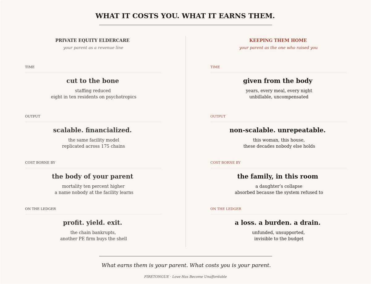 Both columns of the ledger lead to the same parent. What earns them is your parent. What costs you is your parent. The system priced caring for her at the same point the market priced extracting from her. Either way, we pay. Through our own collapse if we keep them home. Through the skeleton of care that keeps them alive a little longer if we don’t.