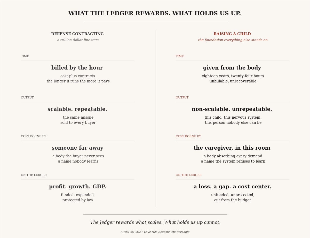 A parent raising a child gives time from the body. Eighteen years, twenty-four hours, unbillable, unrecoverable. The output is non-scalable, unrepeatable — this child, this nervous system, this person nobody else can be. The body that pays the price the ledger refuses to see is in this room. On the ledger: a loss, a gap, a cost center. Unfunded, unprotected, cut from the budget.