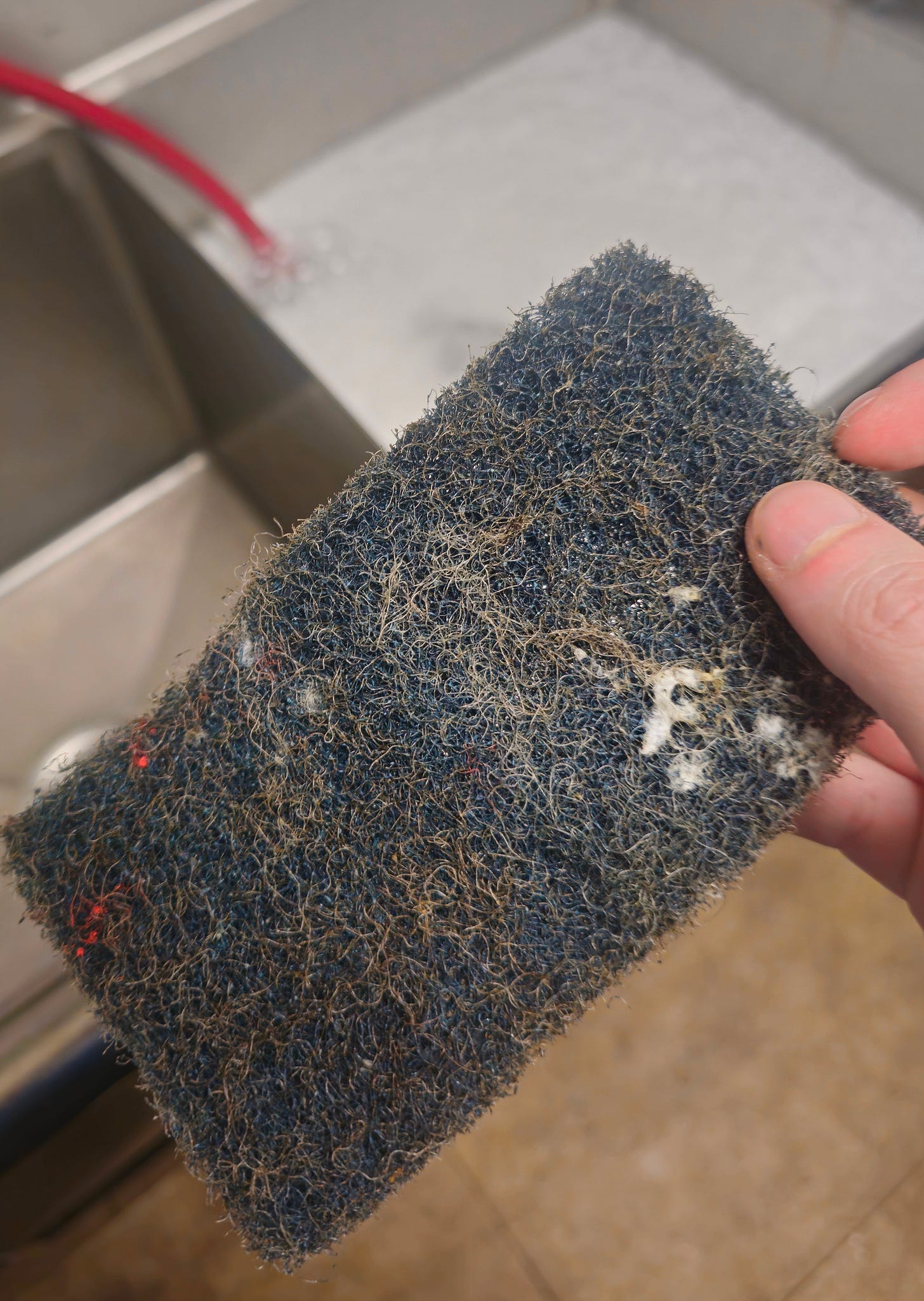It’s slumped in a plastic tub of lukewarm water behind the counter, swollen and barely blue, turning a color that doesn’t exist in nature. In about five minutes, I have to use it to wipe down the coffee station for the fiftieth time today. The air smells like stale hazelnut creamer, burnt drip coffee, and floor cleaner that never quite wins against the grease.