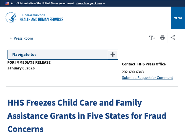 Link: https://www.hhs.gov/press-room/hhs-freezes-child-care-family-assistance-grants-five-states-fraud-concerns.html Source: U.S. Department of Health and Human Services (official press release) Publication: HHS.gov Date: January 6, 2026 Relative Time: One day before the shooting of Renee Good. Note: This funding freeze was blocked by a federal judge on January 9th.