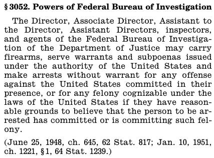 FBI General Arrest Authority: 8 U.S.C. § 3052
