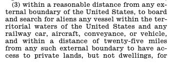 Source: 8 U.S.C. 1357(a)(3) Link: https://www.govinfo.gov/content/pkg/USCODE-2011-title8/pdf/USCODE-2011-title8-chap12-subchapII-partIX-sec1357.pdf Publication: U.S. Code (official federal statute) Lawyer note: Congress did grant vehicle stop and search powers, but only near the border.
