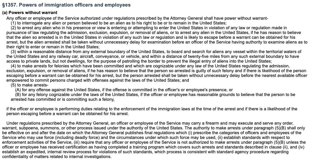 Abbreviated language of ICE agent authority directly from the statute: