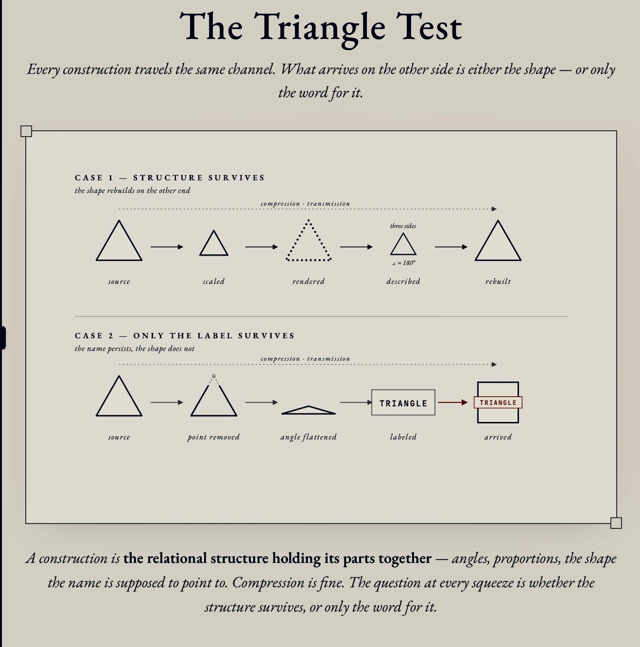 The triangle is the test. What moved through the channel — the shape, or only the word for it?