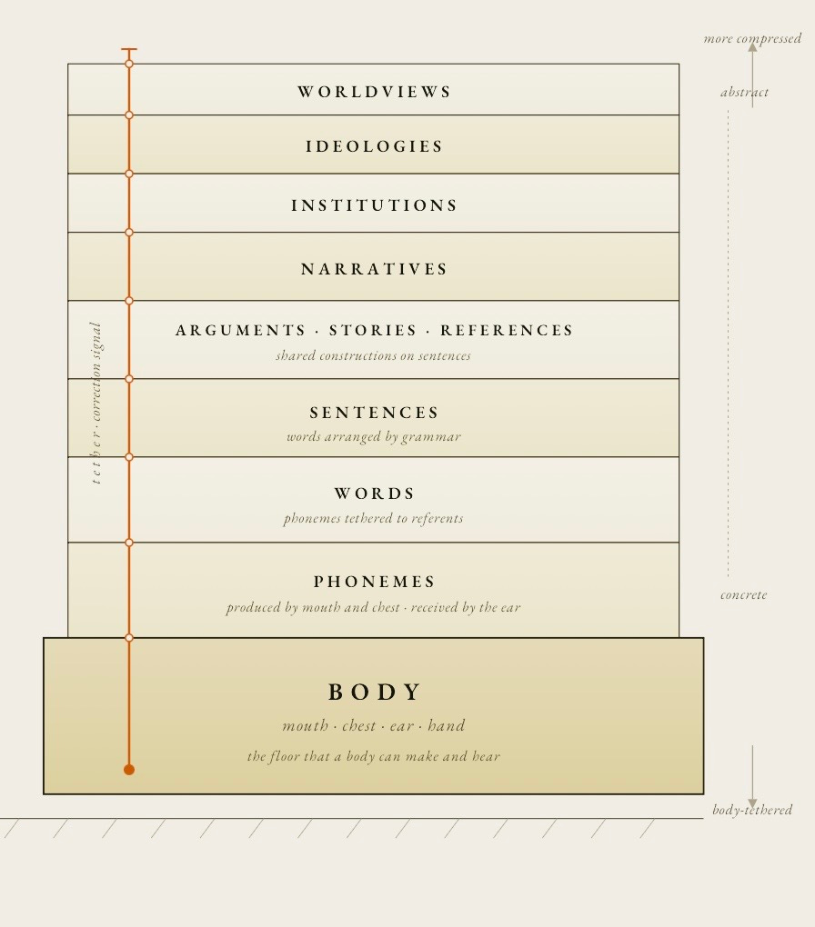 Words sit on phonemes, Sentences on words. Arguments, stories, shared references on sentences. Narratives on those. Institutions on narratives. Ideologies on institutions. Whole shared worldviews rise from there, each level more compressed than the last.