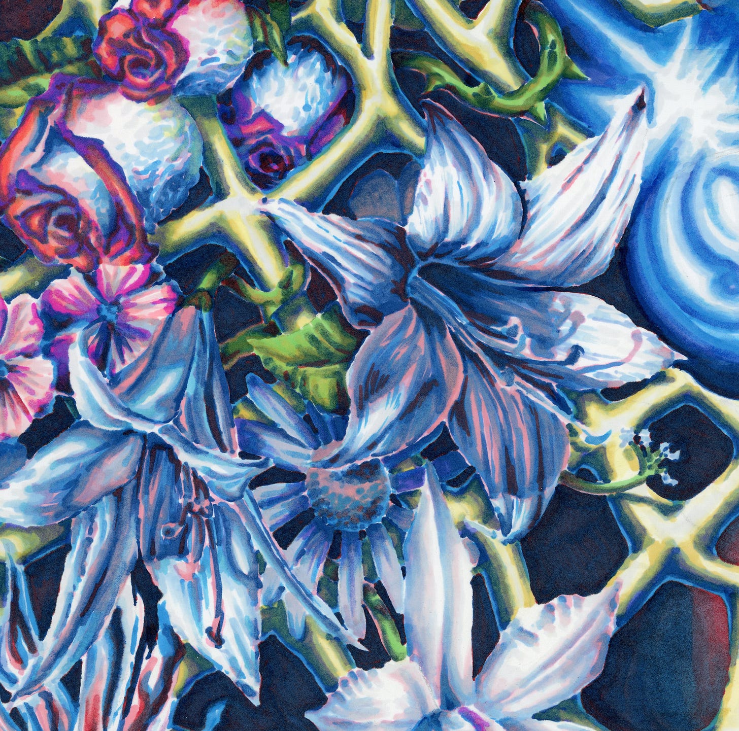This is what the maker’s whole job is — holding the structure of the thing through every stage. The painter working in UV pigment preserved the composition, the proportion, the relational logic of the image through every stroke, knowing it would disappear into the white canvas and only reappear under the right light. The illustrator holds the shape of what they are drawing through every layer of color, every blend, until the image on the paper is the image that started somewhere behind the eye. The writer compresses an experience into a sentence, and the sentence either carries the structure the experience had, or a flattened version that sounds similar and means something else.