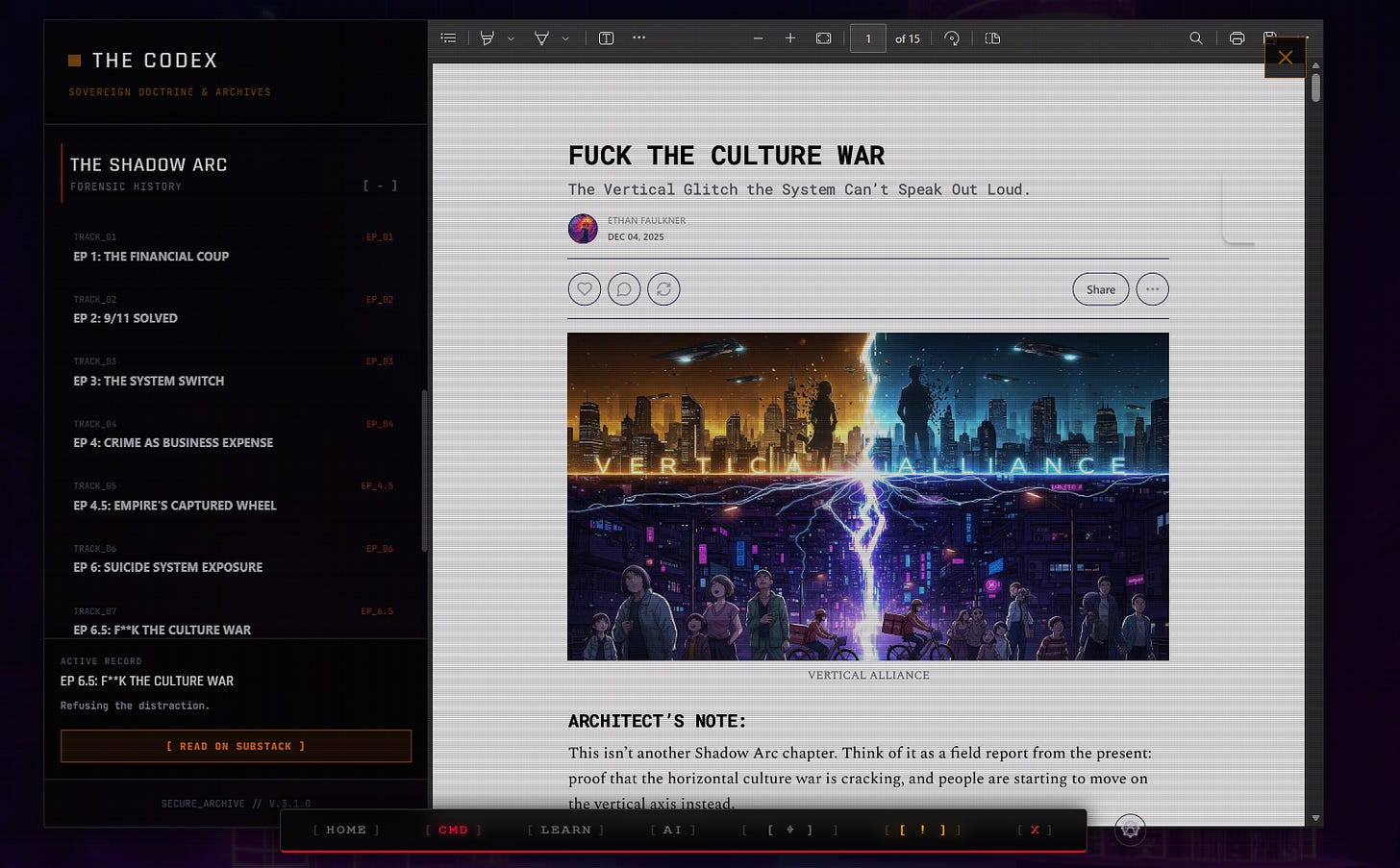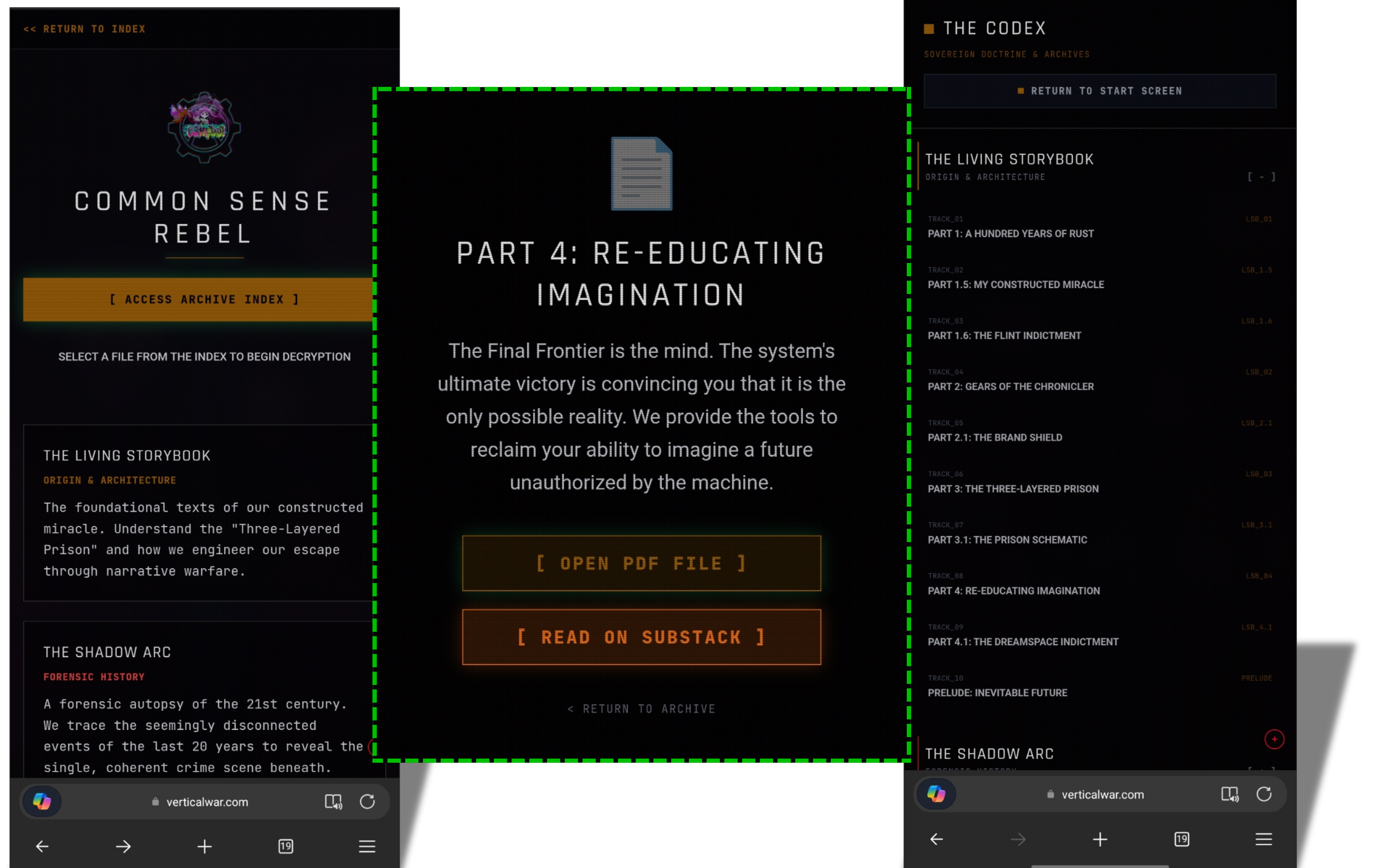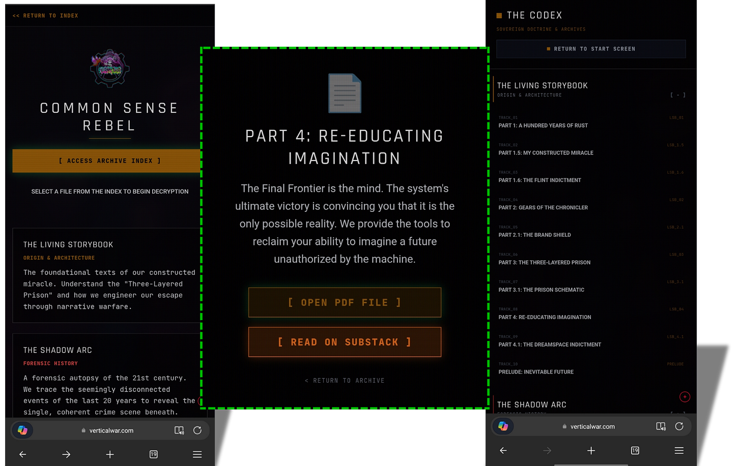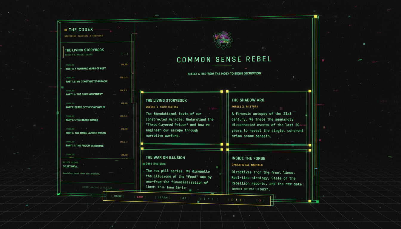The Codex is not a blog. It is an Immutable Library. It is a dedicated, custom-built application designed to house the core series of this rebellion in a permanent, organized structure.