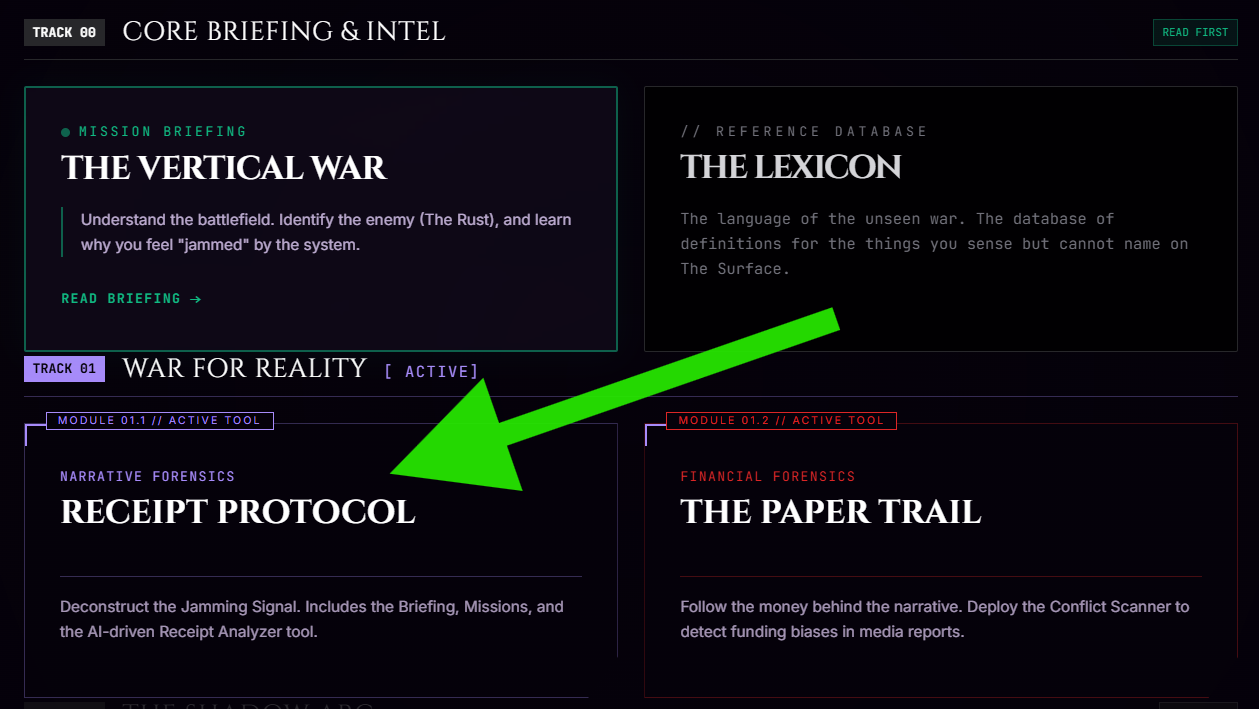 The Drill: A live “Reality Testing” engine that simulates the noise of the feed to test your signal detection.