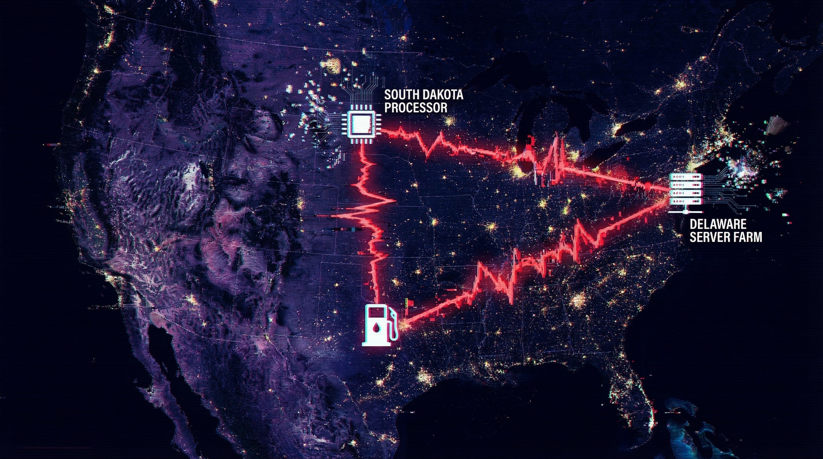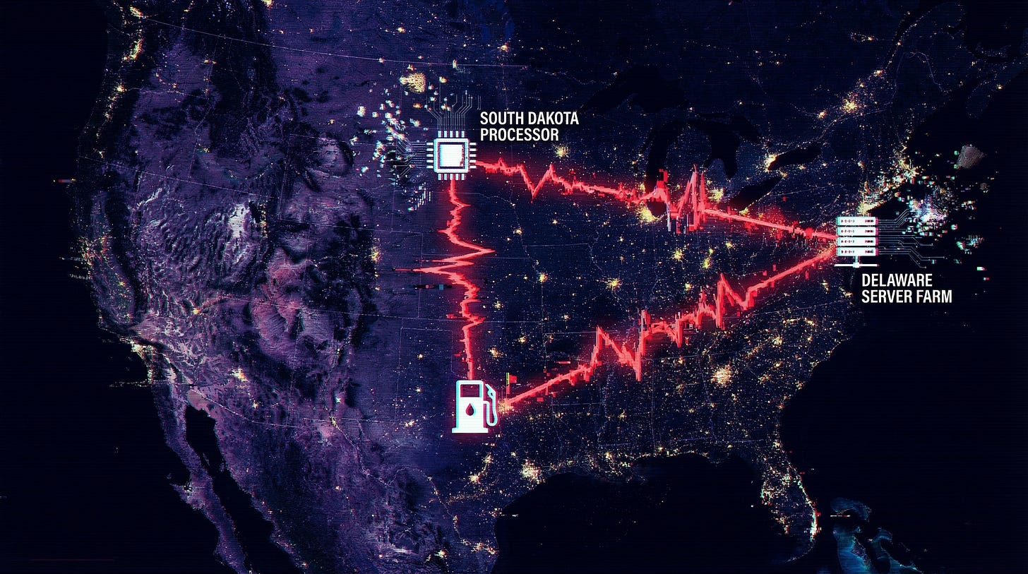 In that millisecond of silence, invisible wires fired. A signal went from this dirty counter to a server farm in Delaware, then to a processor in South Dakota, then back to the pump.