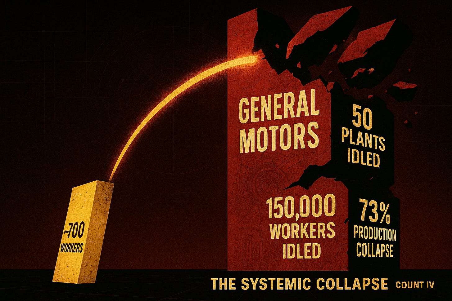 The Collapse: In < 14 days, the action of ~700 workers idled 150,000 employees, shut down 50 plants, and cut GM’s production by 73%.