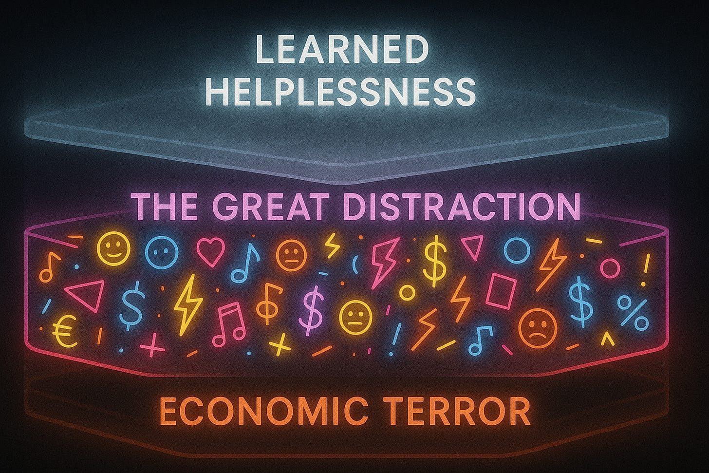 The financial elite (Layer 1) executes a vertical heist. To provide cover, they launder money through “Conduits” (Layer 1) to employ “Agents” (Layer 2) who manufacture a “Great Distraction.” And the whole goddamn thing is wrapped in a psychological field (Layer 3) that uses your phone to convince you that “resistance is futile.”