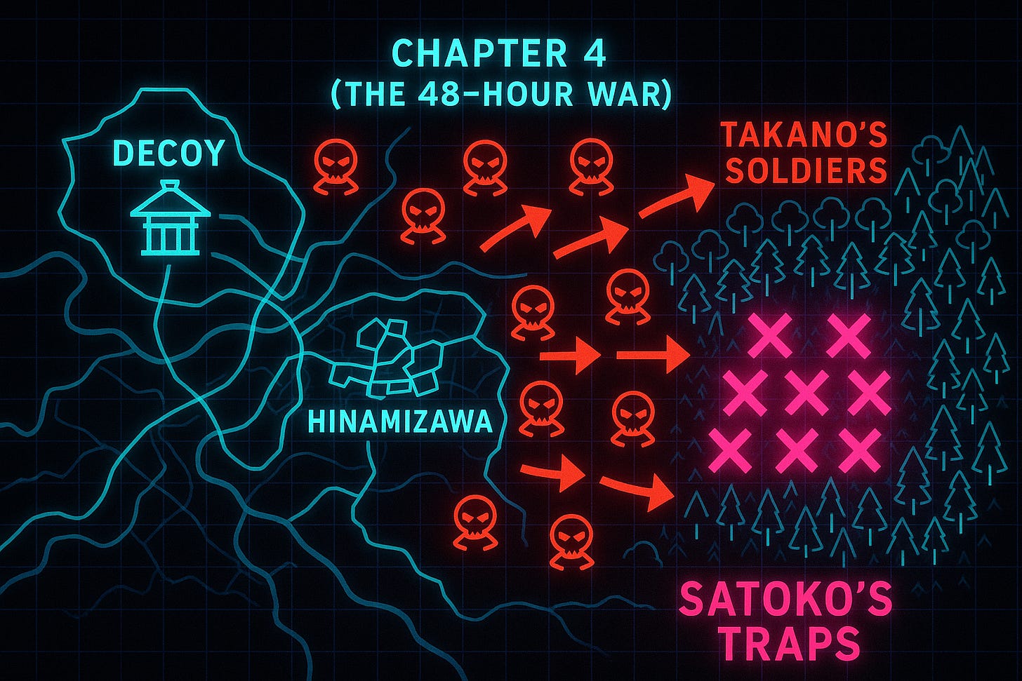 The Labyrinth (Weaponizing the Battlefield): As her “Mountain Hound” soldiers closed in on our hideout, we did not fight them. We lured them into the mountains. And my sweet, broken Satoko... who had spent her whole life building traps to protect herself from an abusive uncle... was a master trap-maker. We turned our home, the forest of Hinamizawa, into a deadly labyrinth that neutralized her technologically superior force.