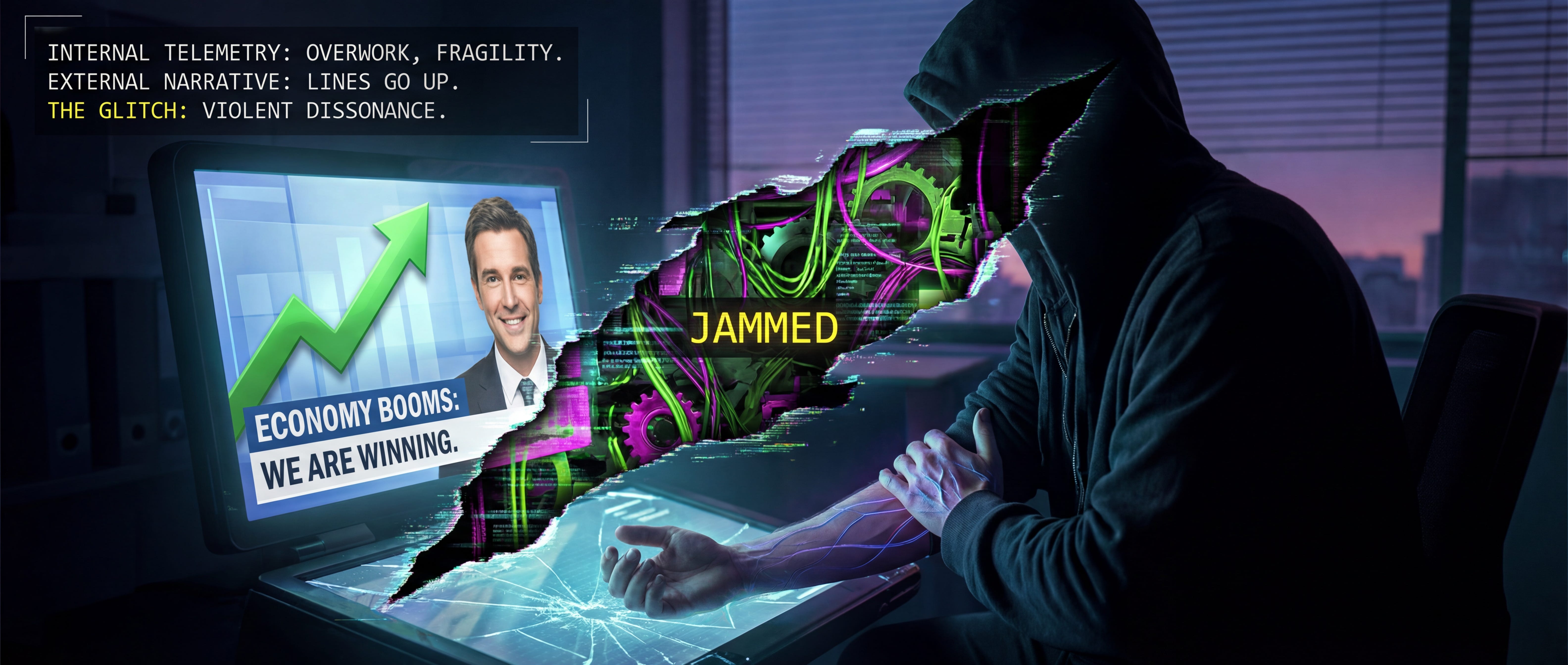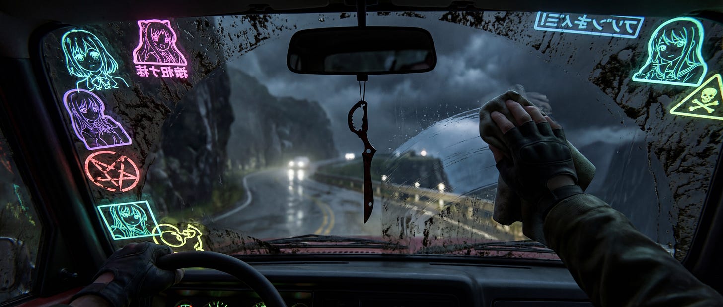 In our world, the windshield is not clear. It is covered in mud. It is plastered with stickers selling you anxiety pills. It has digital overlays projecting a sunny day while your wipers are fighting a hurricane.