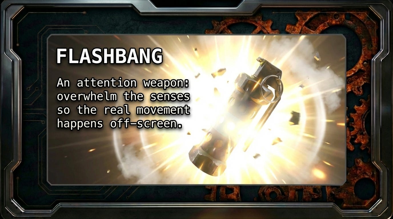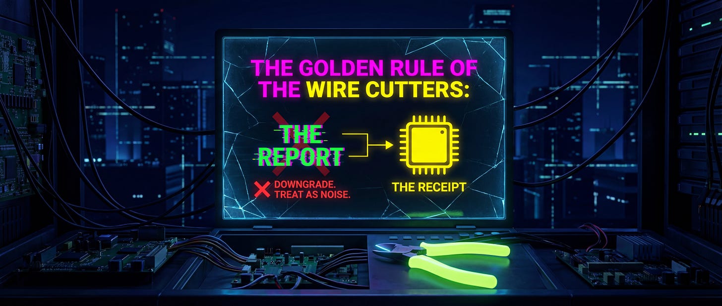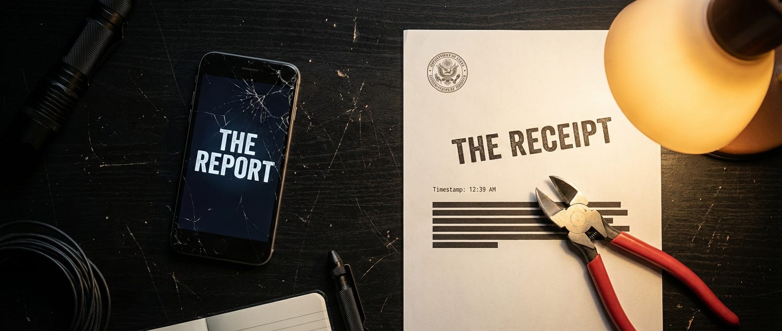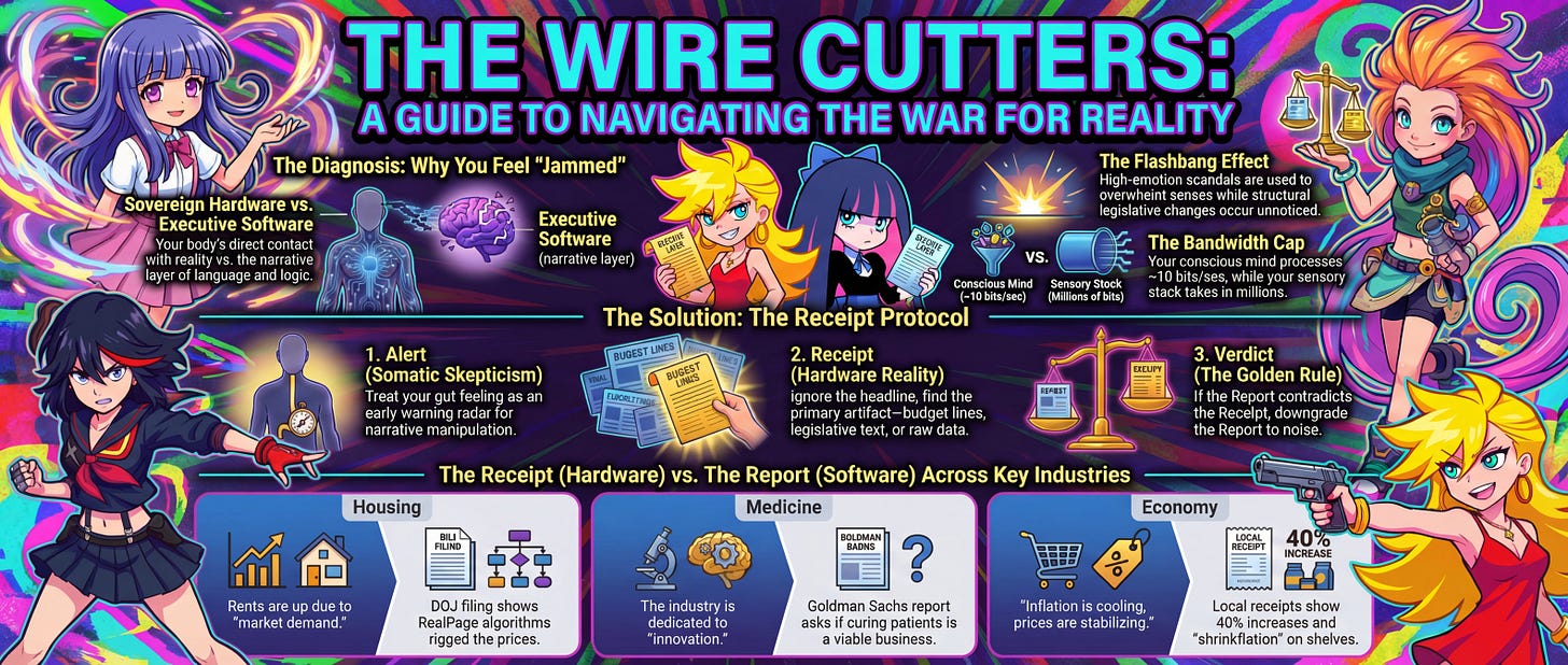 Brilliant breakdown of the Receipt Protocol concept. The Jan 30th flashbang example is textbook distraction tactics, reminded me ofhow during my grad program we'd analyze bills only to find major changes hidden on vote nights. That 10 bits/second vs full sensory bandwidth comparison makes the gut-vs-screen framework actually quantifiable instead of just hand-wavy intuition.
