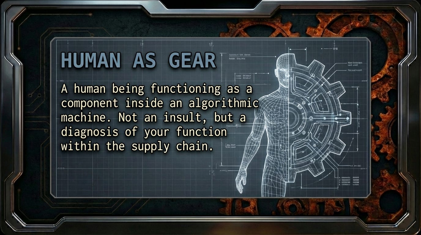 A human being functioning as a component inside an algorithmic machine. Not an insult. A diagnosis.