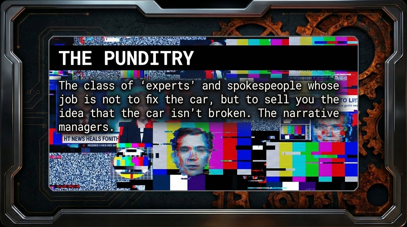 the economists, the spokespeople, the narrative managers. The people whose job is not to fix the car, but to sell you the idea that the car isn’t broken.