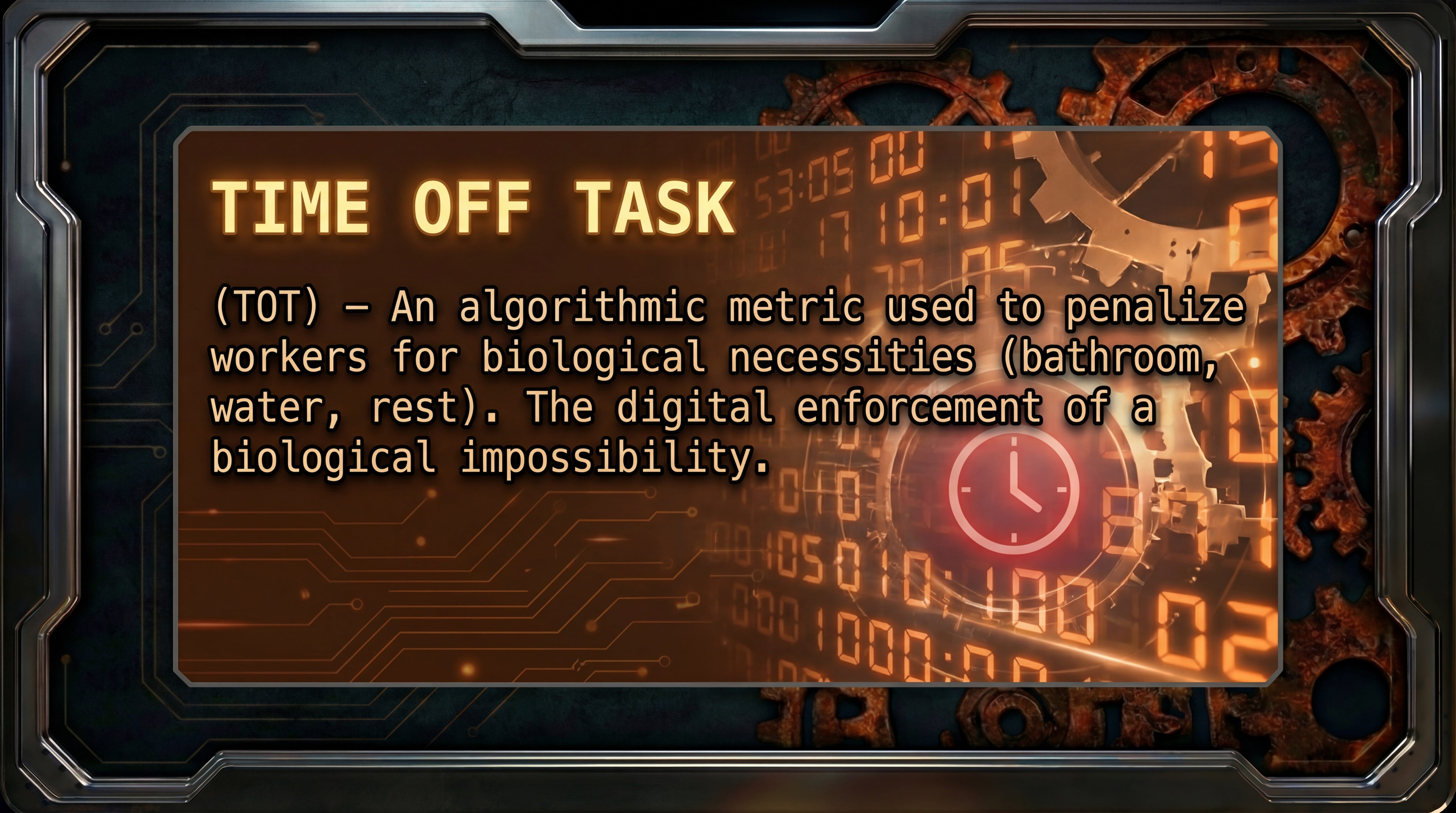 Not a human supervisor. Not a foreman. A system with no face and perfect memory that tracks your “Time Off Task” down to the second. If you stop to hydrate, the number drops. If the number drops, the warnings stack. If the warnings stack, your livelihood disappears.