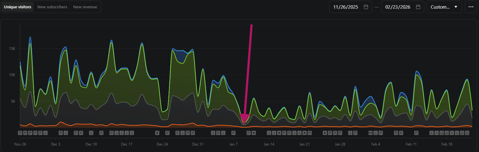 Almost 2 months ago, the signal we were broadcasting on this platform reached escape velocity. The Heavy Round had landed. The Glitch Reports were circulating. The traffic was spiking. The chart was a beautiful upward curve of organic growth.