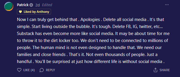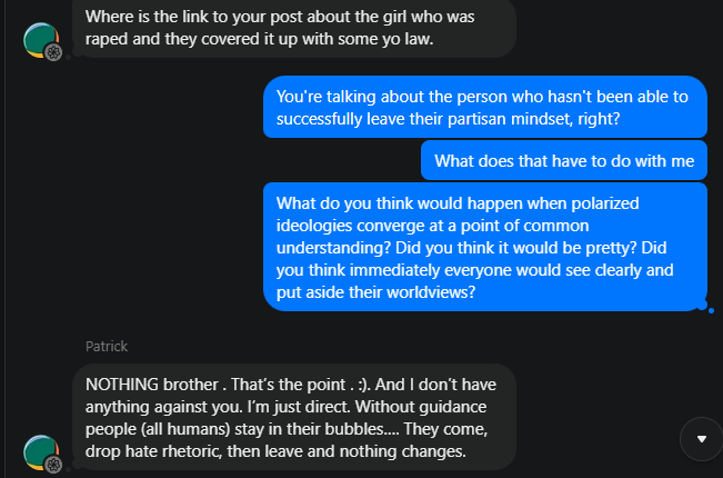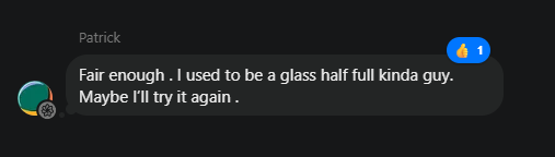 After we went back and forth, after I refused to lock the chat or apologize for the tools... Patrick didn’t leave. He wrote back: “Fair enough. I used to be a glass half full kinda guy. Maybe I’ll try it again.”