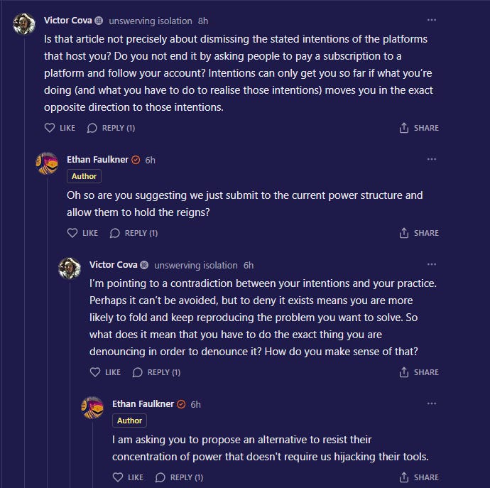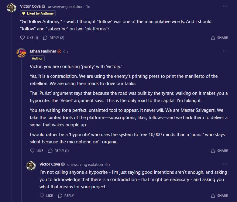 He told me a true rebel would lock the chat, delete the platforms, and stop “driving the thing I’m trying to destroy.”
