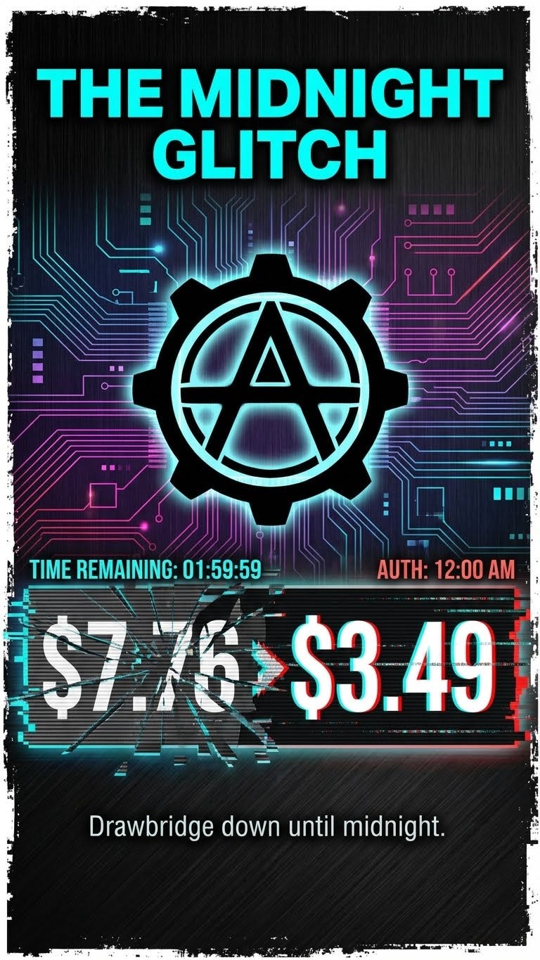 So tonight I’m executing The Midnight Glitch — a deliberate rupture in the pricing model to lower the drawbridge.
