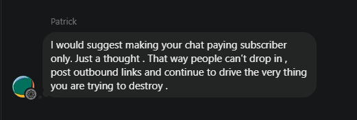 Earlier today, a reader named Patrick walked into my chat like a man with a badge.