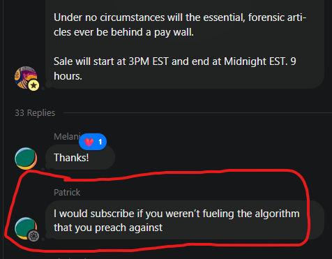 He said he won’t subscribe because I’m “fueling the algorithm” I claim to fight.