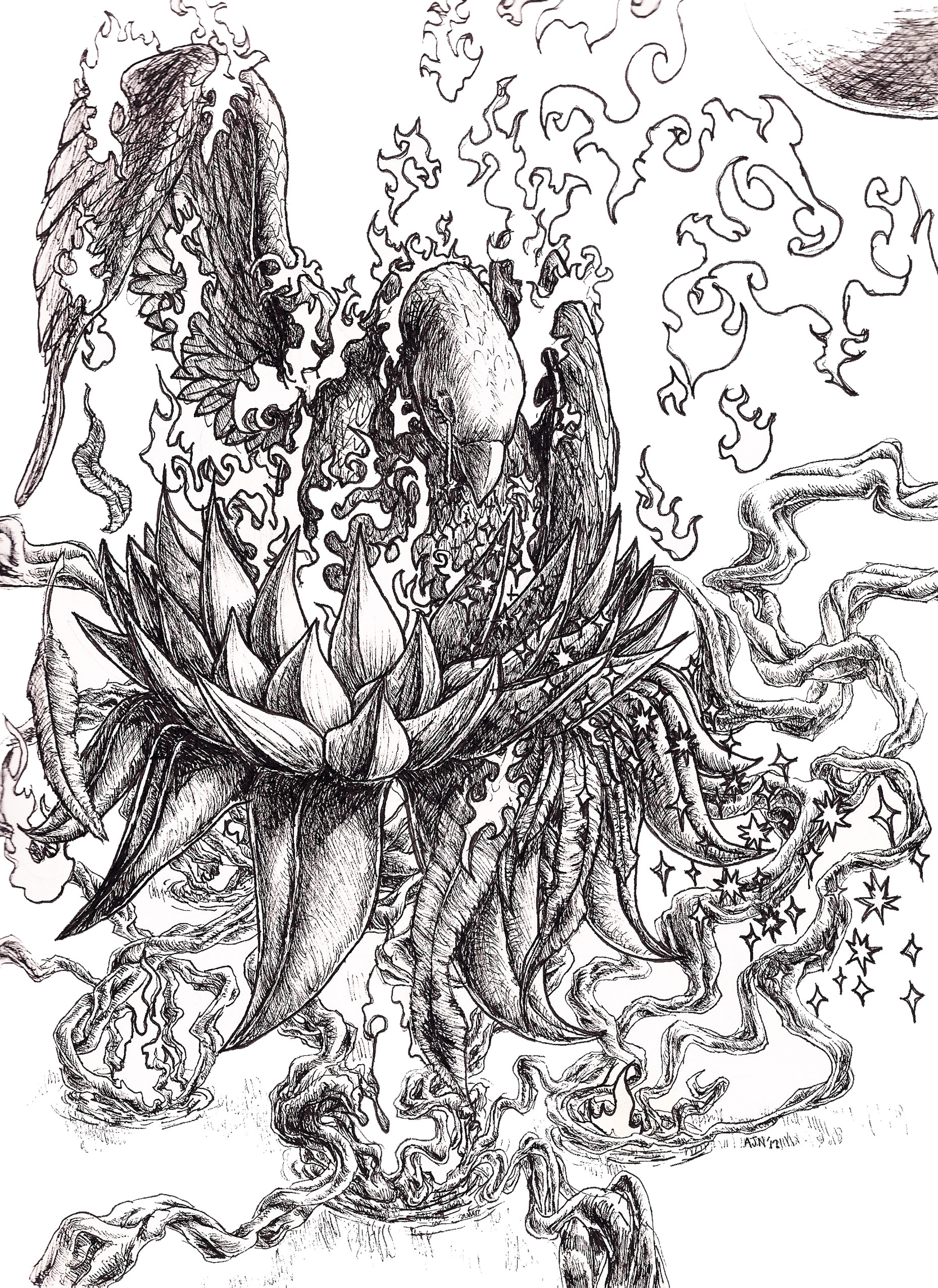 It started with open arms and bright budding irises, expanding cohesion in a promise of infinity. Then the clock read some numbers, the movement became a bit more precise, and the pulse swelled something more than pure blood. Jaded, jaw-grinding, bones cementing to gravity, and mind boiling to a dry dread, the soul found itself filtered and famished, the body slowly withdrawing into a hugging recoil. Bruises and blasphemy, scars and scalps, heaven and heartbreak, cuts and cognition, the statue solidified with an arm outstretched, reaching, always, tendons in a tight knot.