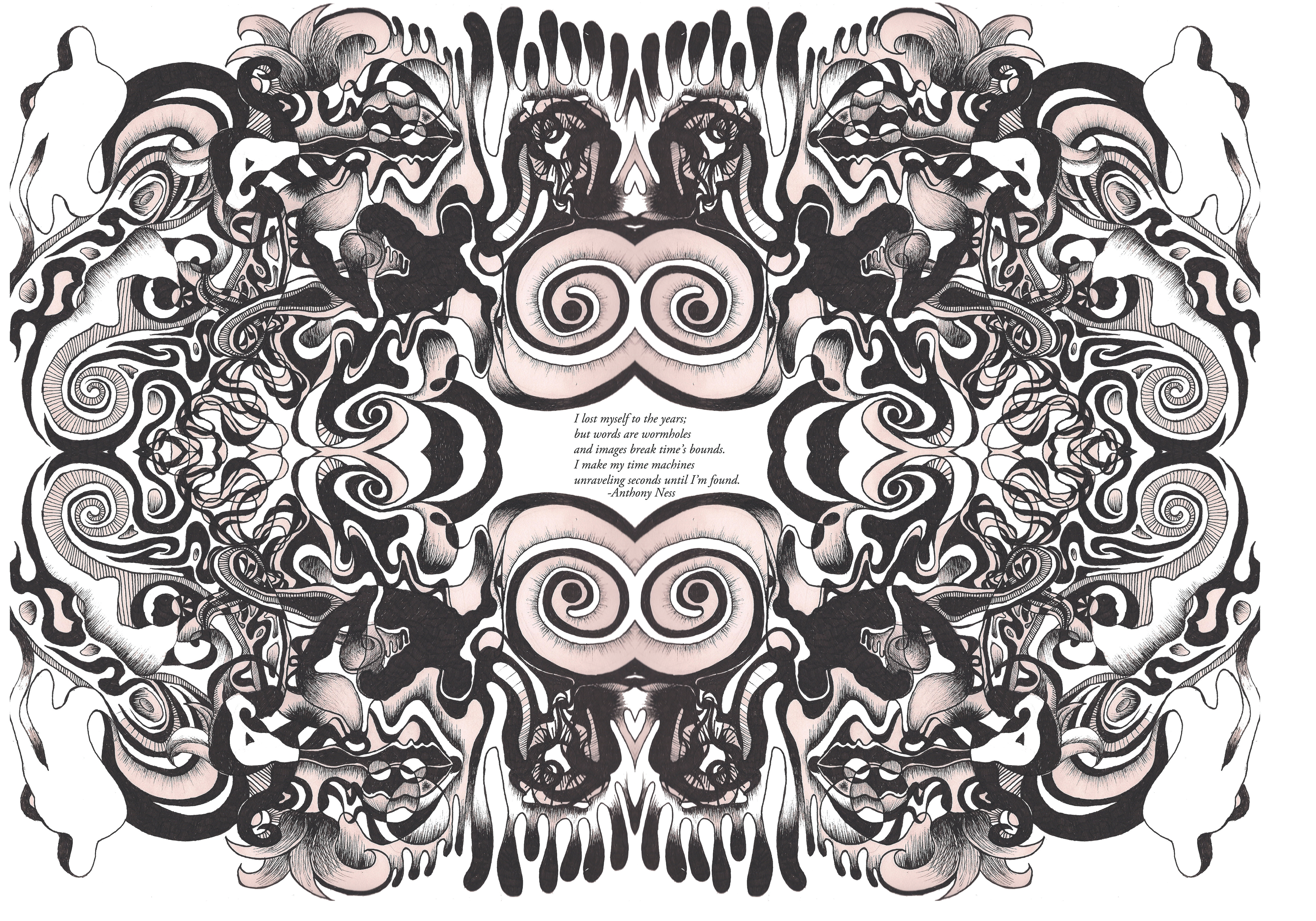 So I see a hole in my head, that leads to a hole in my heart, that leads to a hole in my soul, that leads to a hole in the world, that leads to a hole in the very universe. I walk into the vast emptiness, endless and expansive, to find a place so deep and distant it could not exist, but here I am. And I travel the circle that leads back to the mirror, to the pit of my pupil, to the morgues of my mind, to the hollows in my heart, and deeper until I face myself again.