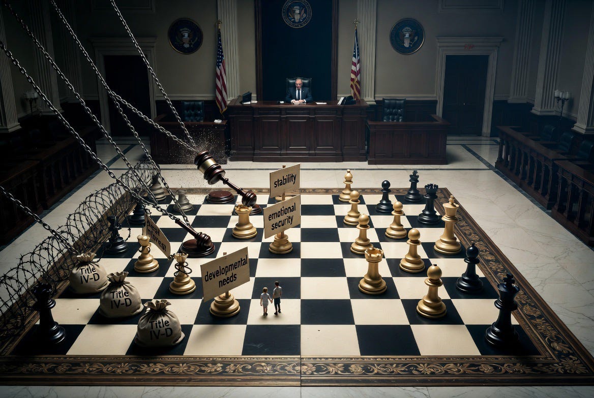 The court does not know the parent. The court does not know their children. The court knows a case number, an income figure, an address, a schedule. From this—from an abstraction—it claims the authority to define what “stability” and “emotional security” and “developmental needs” mean for a family it has never inhabited.