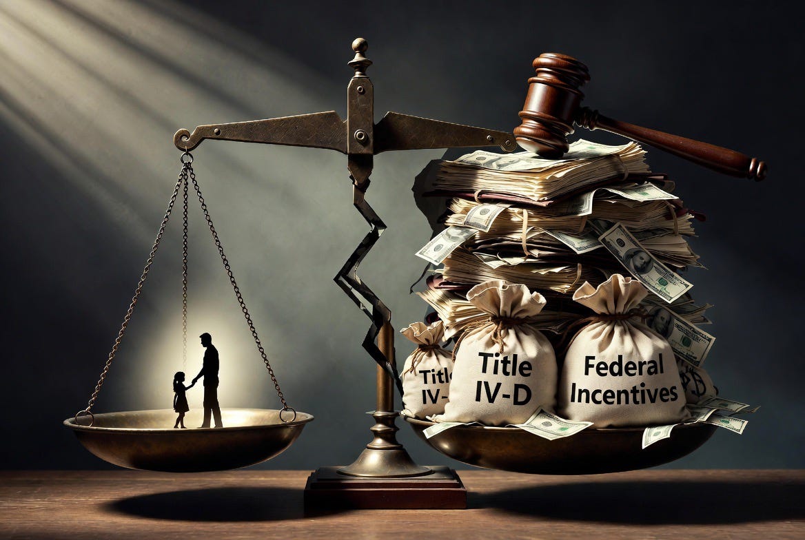 And the incentive to cash it is literal. Under Title IV-D of the Social Security Act, the federal government reimburses states 66% of child support enforcement costs and pays additional incentive funding based on performance measures weighted toward collections volume (4). Higher support orders generate higher collections. Higher collections generate more federal money. Equal custody arrangements between parents with comparable incomes produce lower support obligations—and lower federal revenue for the state. The system is financially rewarded for fracturing families and penalized for keeping them whole. The law requires a judge to explain findings for each factor. It does not require those findings to rest on anything the family would recognize as true.